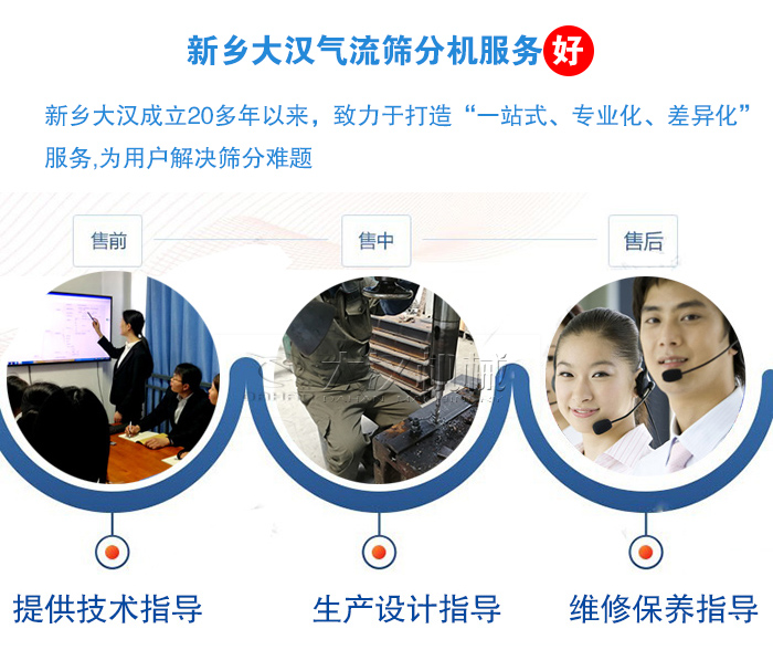 新鄉(xiāng)大漢成立20多年以來(lái),致力于打造“一站式、專(zhuān)業(yè)化、差異化”服務(wù),免費(fèi)對(duì)用戶進(jìn)行選型指導(dǎo)和安裝、調(diào)試及后期維修服務(wù),不斷加強(qiáng)改善用戶的體驗(yàn),用戶購(gòu)買(mǎi)我們的設(shè)備之后,我們會(huì)定期進(jìn)行回訪調(diào)查,真實(shí)了解到每一位用戶的使用情況,以全面、細(xì)致的服務(wù)解決用戶所遇到的篩分難題。